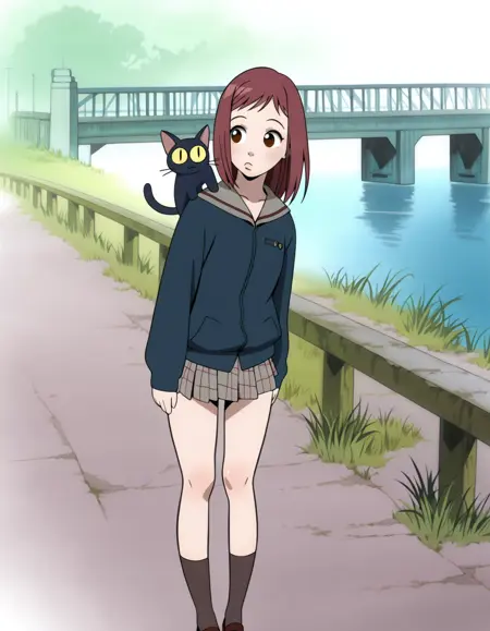 마미미, 세라후쿠, 체크무늬 치마, 타쿠ン, 어깨에 고양이