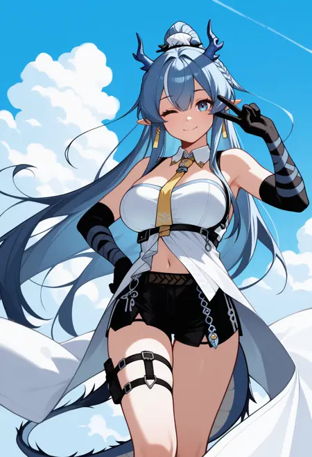 기본 복장: l1ngdef, dragon tail, streaked hair, blue hair, white hair, hair between eyes, braid, high ponytail, blue horns, dragon horns, pointy ears, blue eyes, white coat, open coat, long sleeves, wide sleeves, white shirt, strapless shirt, detached collar, yellow necktie, underbust, black gloves, elbow gloves, arm wrap, black shorts, short shorts, thigh strap, white footwear, tassel earrings, navel, large breasts