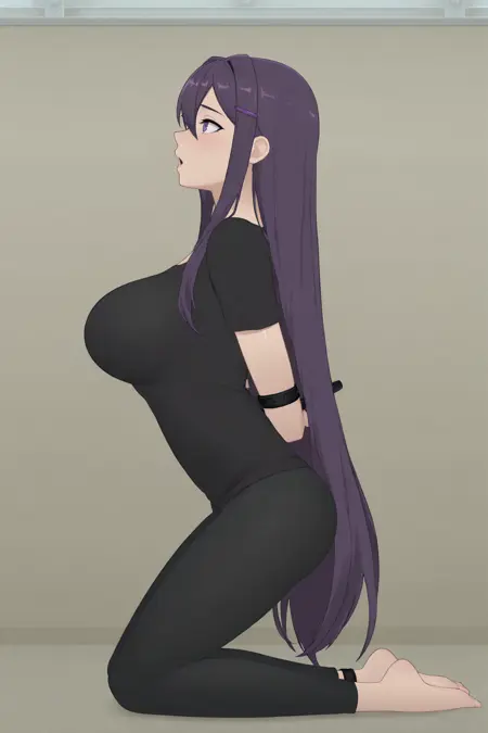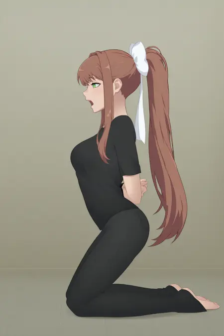 sdtstyle, 1girl, kneeling, arms behind back, bound, from side, side view, open mouth