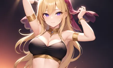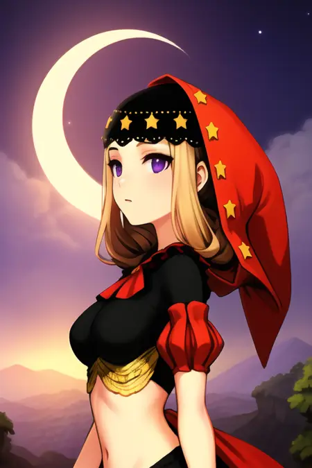 To prompt this character, enter "lora:Velvetv3:strengthvelvetos, red hood, black crop top with red puffy sleeves, star headdress, waist cape, vertical-striped stockings, high heels,"