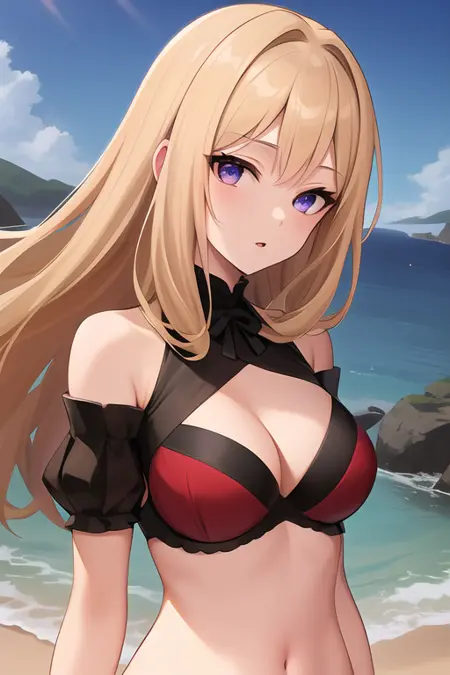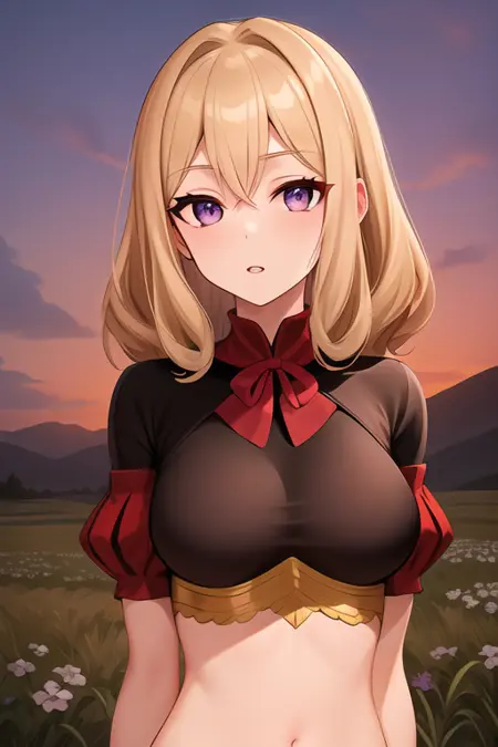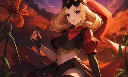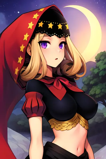 To prompt this character, enter "lora:Velvetv3:strengthvelvetos, red hood, black crop top with red puffy sleeves, star headdress, waist cape, vertical-striped stockings, high heels,"