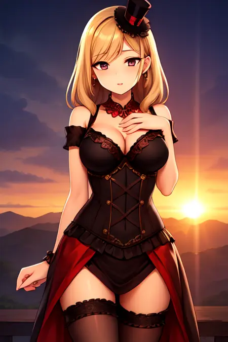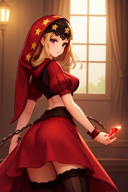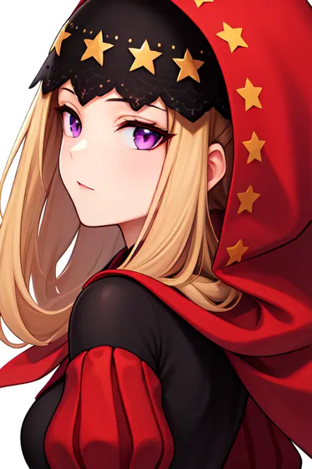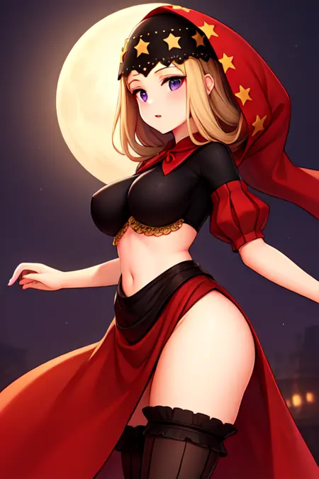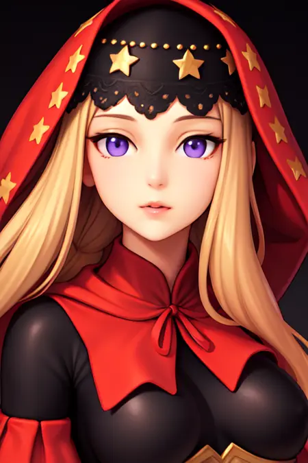要使用该角色的提示词,请输入:lora:Velvetv3:strengthvelvetos, red hood, black crop top with red puffy sleeves, star headdress, waist cape, vertical-striped stockings, high heels