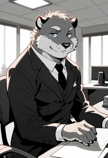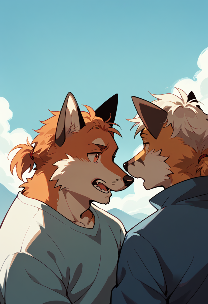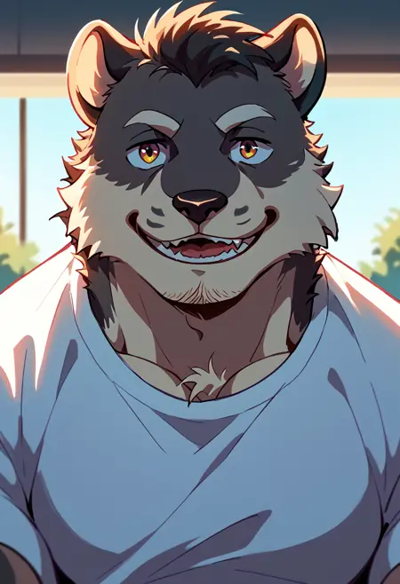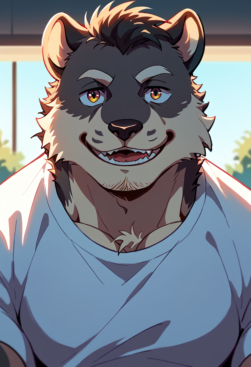 Pony: score_9, score_8_up, score_7_up, depth of field, best quality, high res, by fruitz, furry, furry male, male focus, animal ears, 1boy/2boys, solo/duo, tail, smile, looking at viewer, muscular ...your tags...