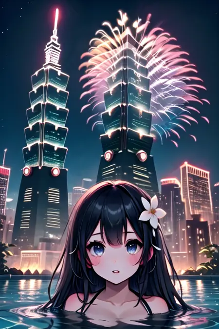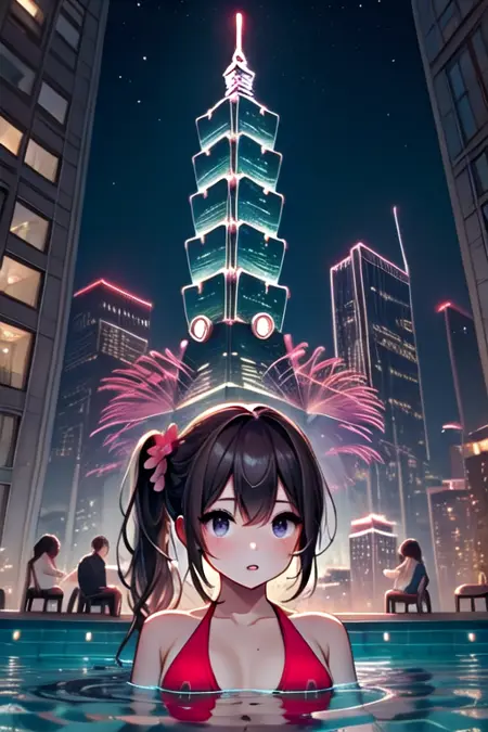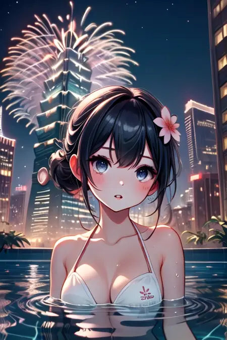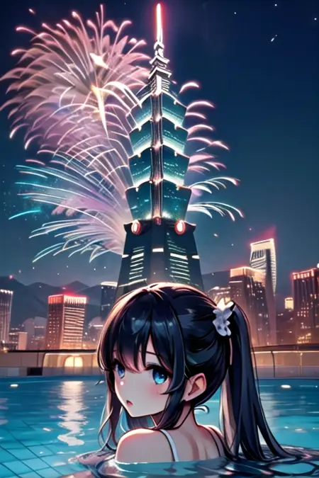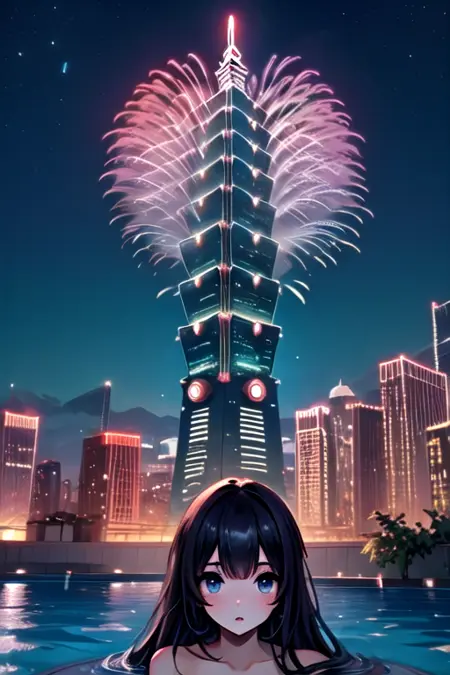 注意:水着の色がやや不規則なため、ワードプロンプトの重みを増やす必要がある場合があります。トレーニングはややオーバーフィットしています。台北101に花火を集中させるために、画像の接合にまれにエラーが発生します。(SD 1.5)