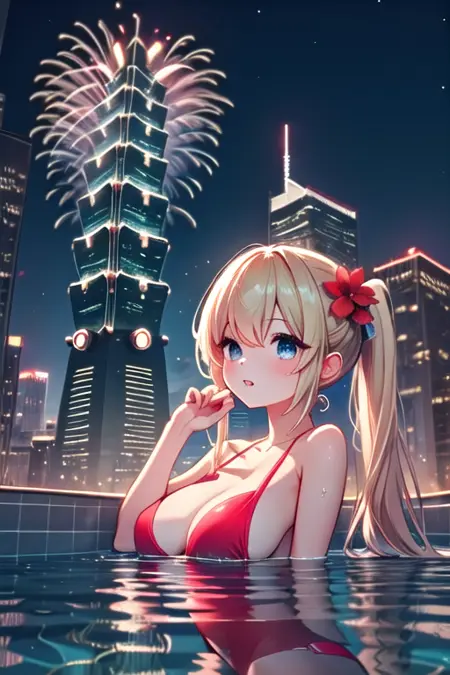 참고: 수영복의 색상이 잘 따라주지 않으므로, 가중치를 증가시켜야 할 수 있습니다. 학습이 다소 과적합되었습니다. 타이페이 101에 불꽃놀이를 집중시키기 위해 이미지 결합에 종종 오류가 발생할 수 있습니다. (SD 1.5)
