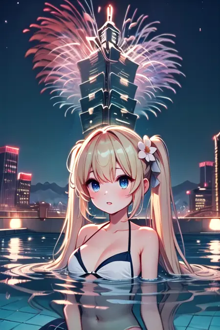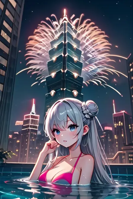 注意:花火の安定性がやや低いため、ステップ数を調整する必要があります。A1111 WebUIのステップバイステップレンダリングを使用するのが有効です。NSFWを希望する場合は、「部分的に浸かっている」「入浴中」「水泳中」を削除するか、「下から」を追加してください。(Pony)