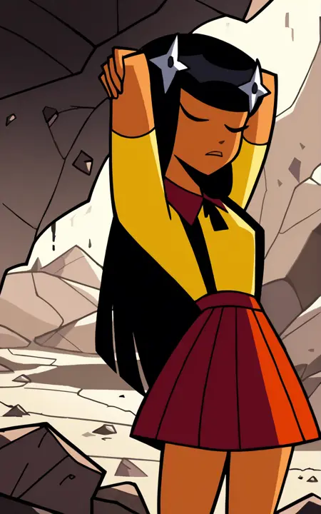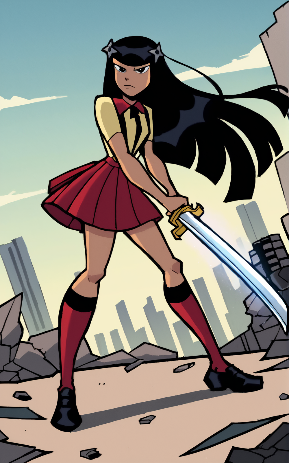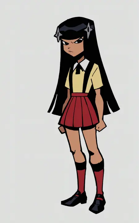 Reinforcement Tags: hair ornament, black eyes, black hair, long hair, blunt bangsFor her Outfit:** **short sleeves, skirt, red skirt, yellow shirt, collared, suspenders, suspender skirt, pleated skirt, red socks, socks, black footwear