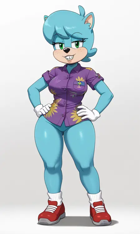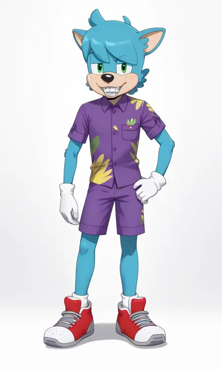 Dave the Intern, tall, lanky, aqua blue fur, green eyes, buck teeth, lavender Hawaiian shirt with yellow flowers, red shoes
