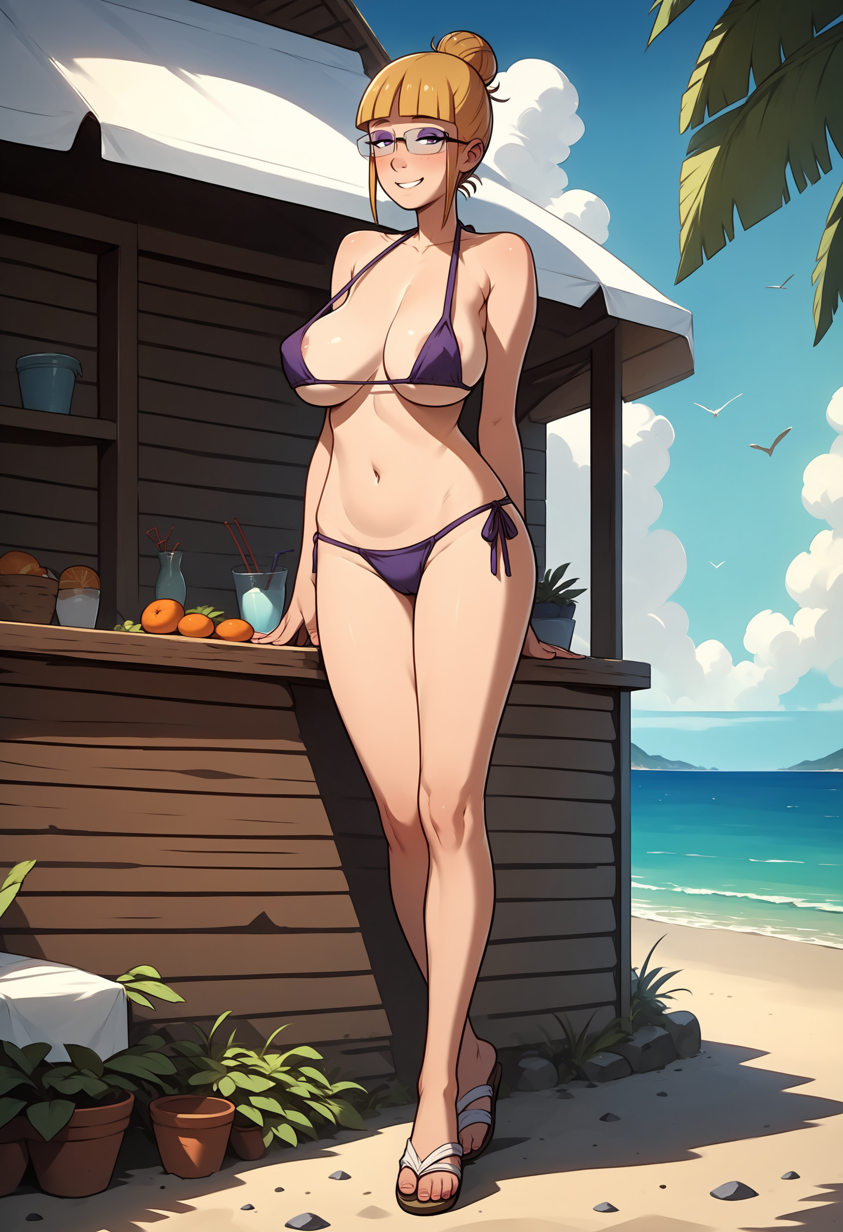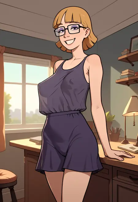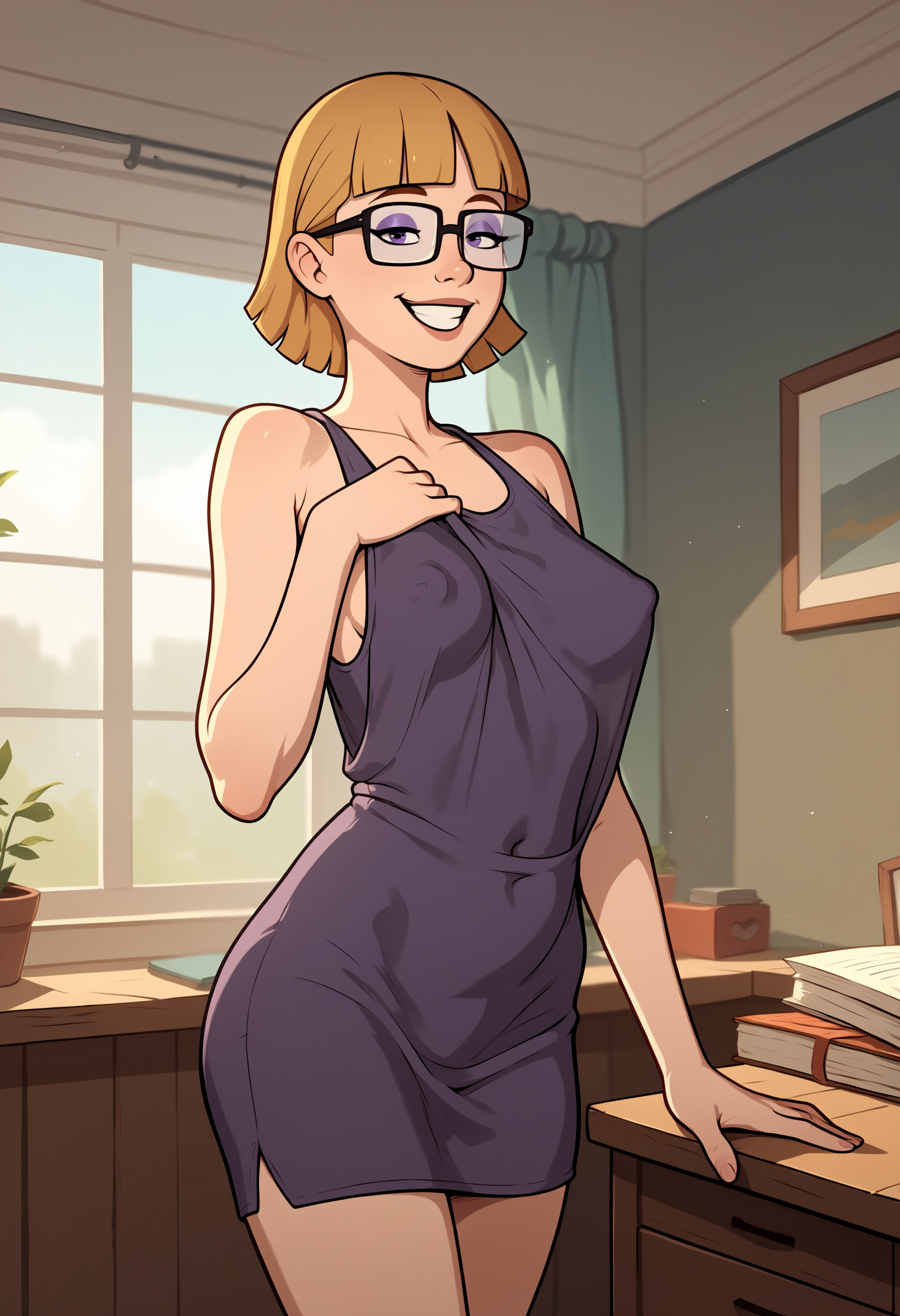 - Miriam_Pataki_Fan_Art_Style, blonde, blunt bangs, purple eyeshadow,