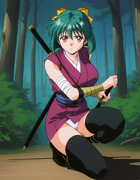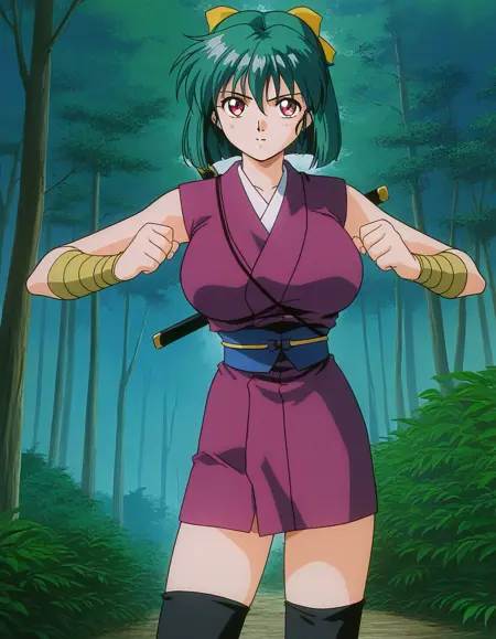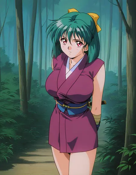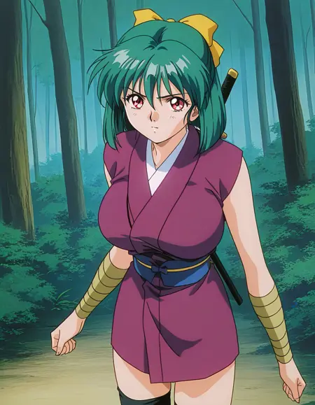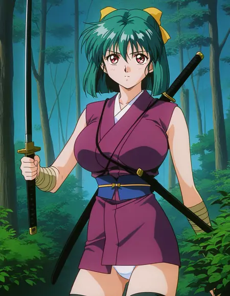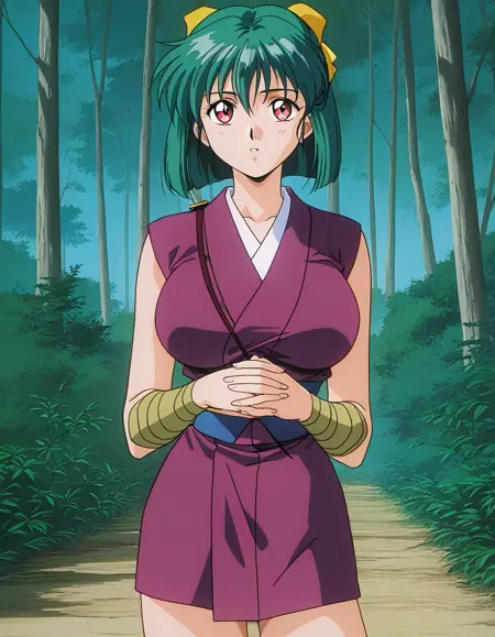 Yaku, 1girl, green hair, short hair, red eyes, large breasts, hair ribbon, yellow bow, 1990s (style), anime coloring,