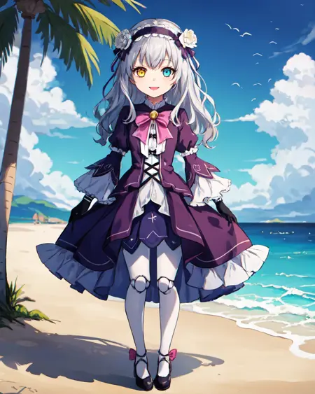 ヘッドバンド、髪飾り、紫のドレス、ゴシックロリータ、フリル、リボン、(白いパンティストッキング)、黒の手袋、