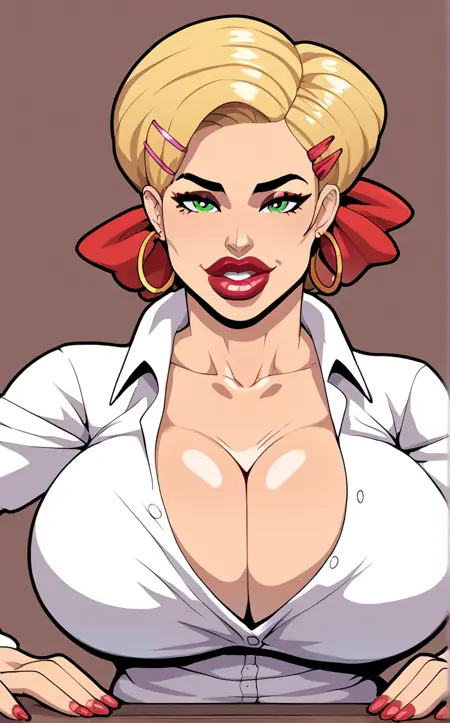 PONYXL_STYLE_loonyjams_ownwaifu, 1girl, long hair, large breasts, blue eyes, blonde hair, brown gloves, cleavage, bare shoulders, red lips, strapless, makeup, lipstick, bursting breasts, looking at viewer, cowboy hat, pointing, ^^^, brown headwear, pink skin