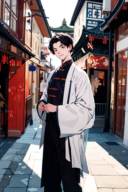 扁平插画风格LoRA,适用于国风场景和服饰。其他题材也可尝试,因其作为画风模型训练,泛化性良好。搭配漫画类/手绘类大模型时,可生成极简画风;搭配写实类大模型时,主要影响人物画风,场景变化相对较小。