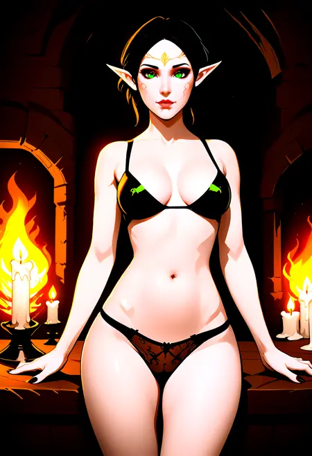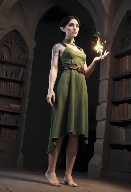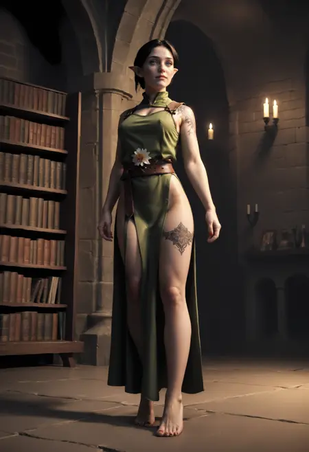 권장 태그: dalish, 엘프, 녹색 눈, 얼굴 문신, 갑옷, 날카로운 귀, 발가락이 없는 하의, 손가락이 없는 장갑, 검은 머리, 단발, 스카프