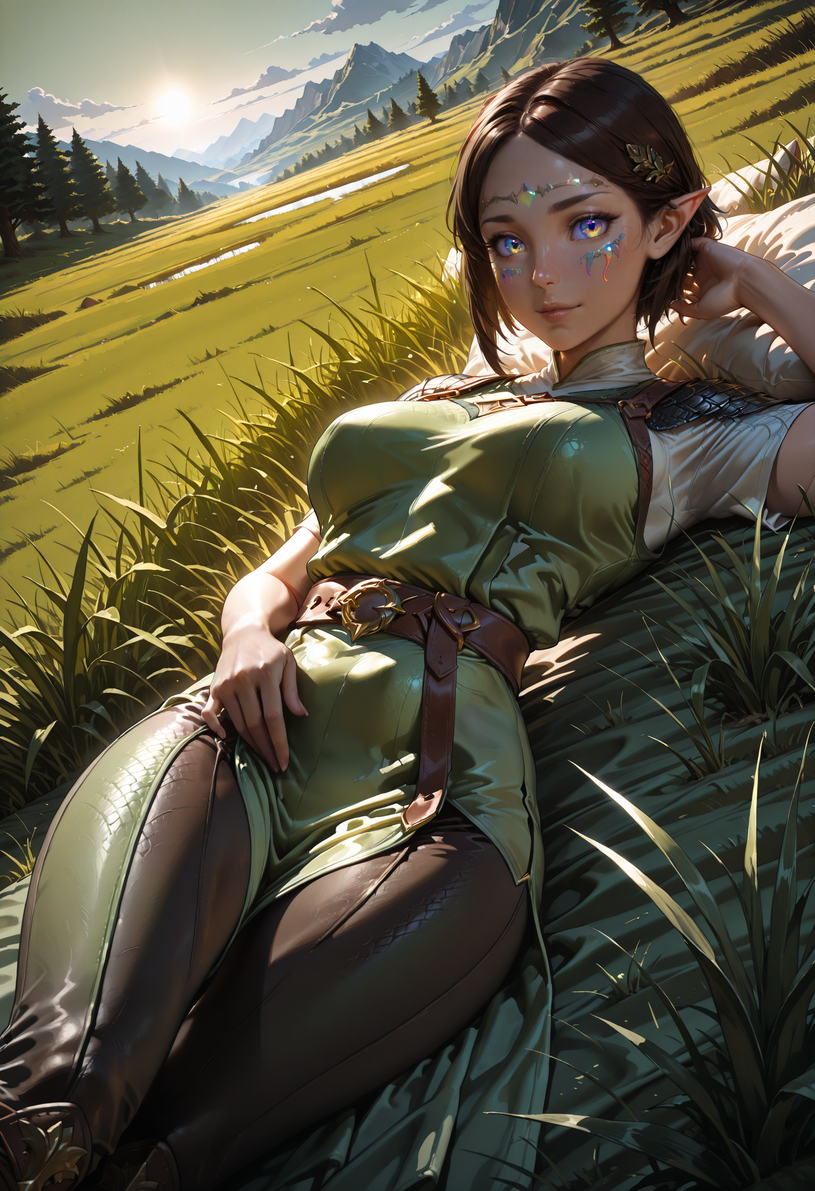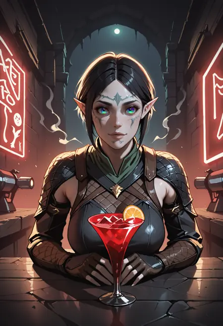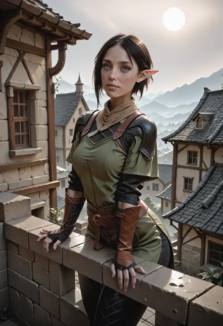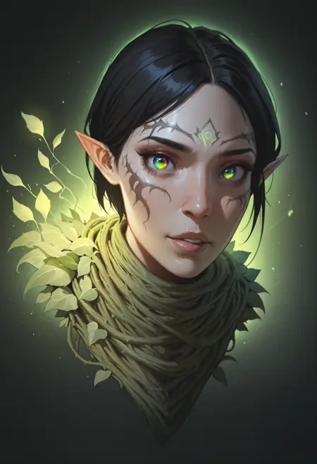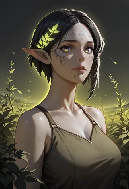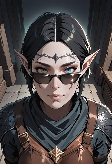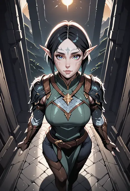 권장 태그: dalish, 엘프, 녹색 눈, 얼굴 문신, 갑옷, 날카로운 귀, 발가락이 없는 하의, 손가락이 없는 장갑, 검은 머리, 단발, 스카프