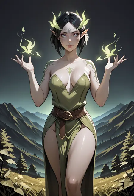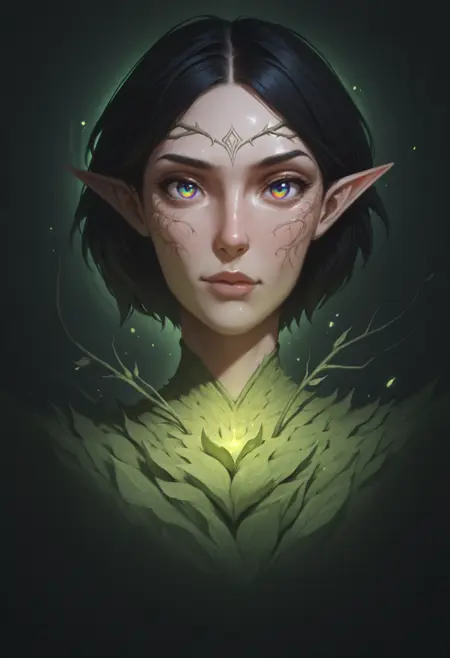suggested tags: dalish, elf, green eyes, facial tattoo, armor, pointy ears, toeless legwear, fingerless gloves, black hair, short hair, scarf