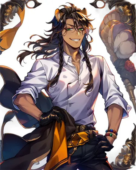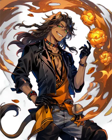 寮服(寮服):dormitory uniform, braid, jewelry, gloves, tail, bracelet, black gloves, necklace, leather jacket,
