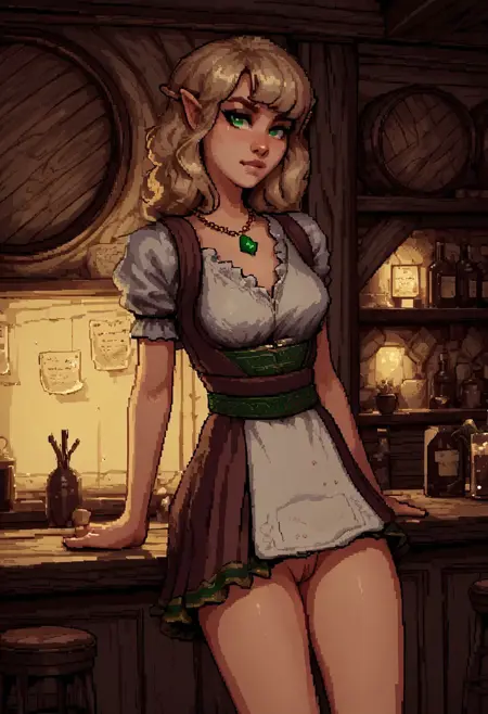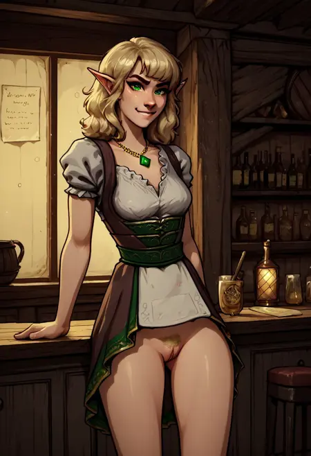 프롬프트: CRYST4L, 엘프 소녀, 뾰족한 귀, 에프론, 짧은 스커트, 금발 머리