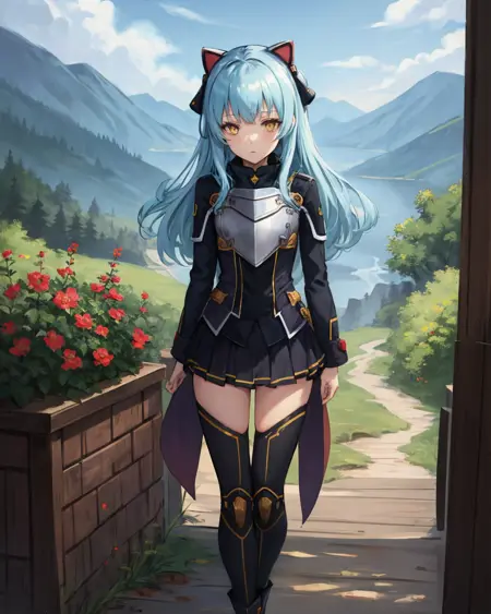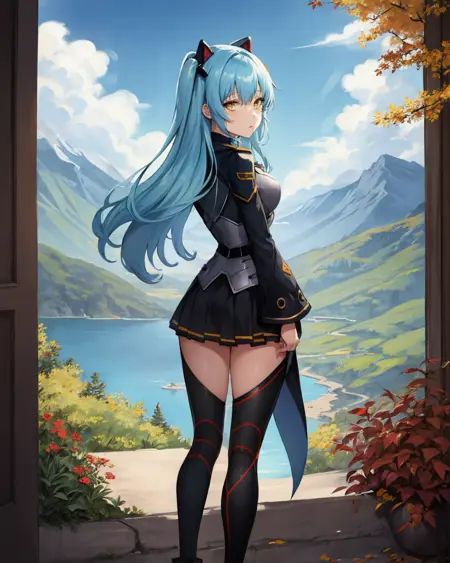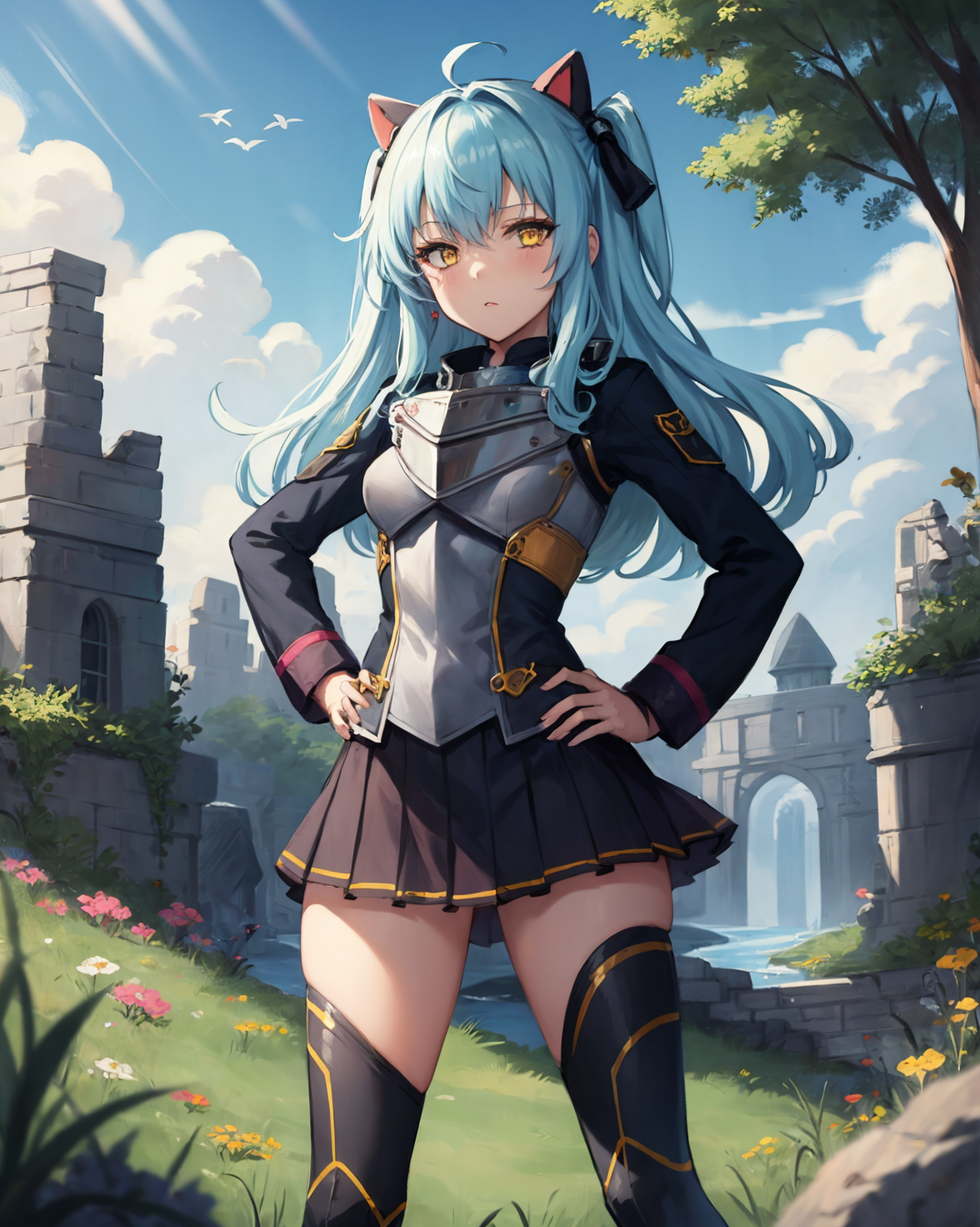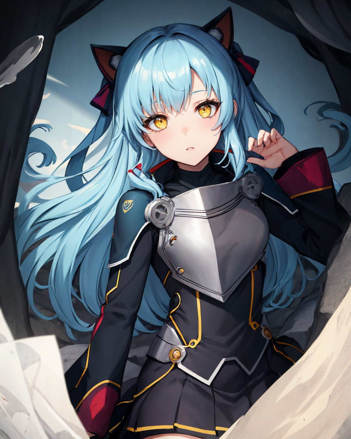 <lora:TioCS3:0.9>, Tio Plato, 黄色い目, 水色の髪, 長い髪, 両サイドをアップ, 小さな胸,
