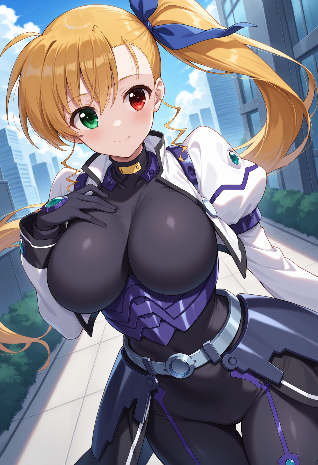 masterpiece, absurdres, highres, 1girl, c-vivio, long hair, side ponytail, blonde hair, heterochromia, hair ribbon, aged up, large breasts, black bodysuit, armor, white cropped vest, juliet sleeves, long sleeves, black gloves, waist cape, indoors, looking at viewer, day,