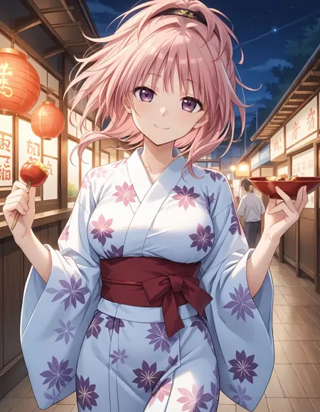kimiko, pink hair, hair up, hair band, black band, purple eyes, large breasts, mature female,