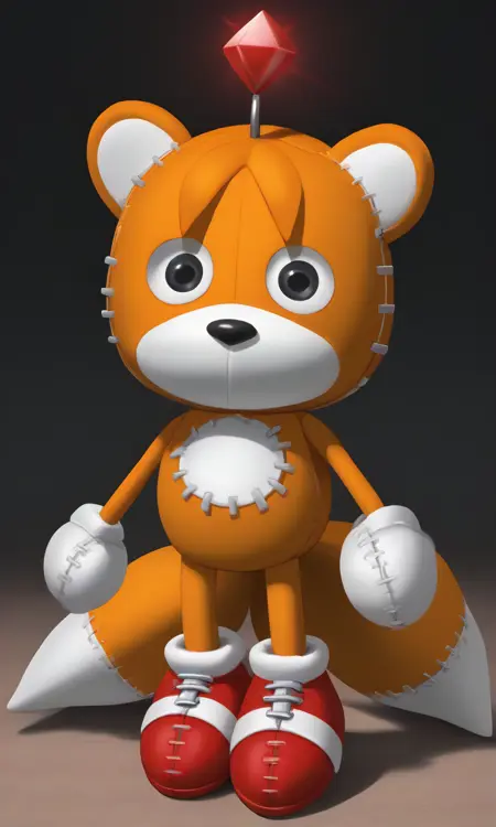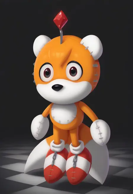 Tails Doll, orange skin, wide eyes, black pupils, no mouth, metal antenna with red orb, stitches, gray zipper on back, white gloves, red shoes