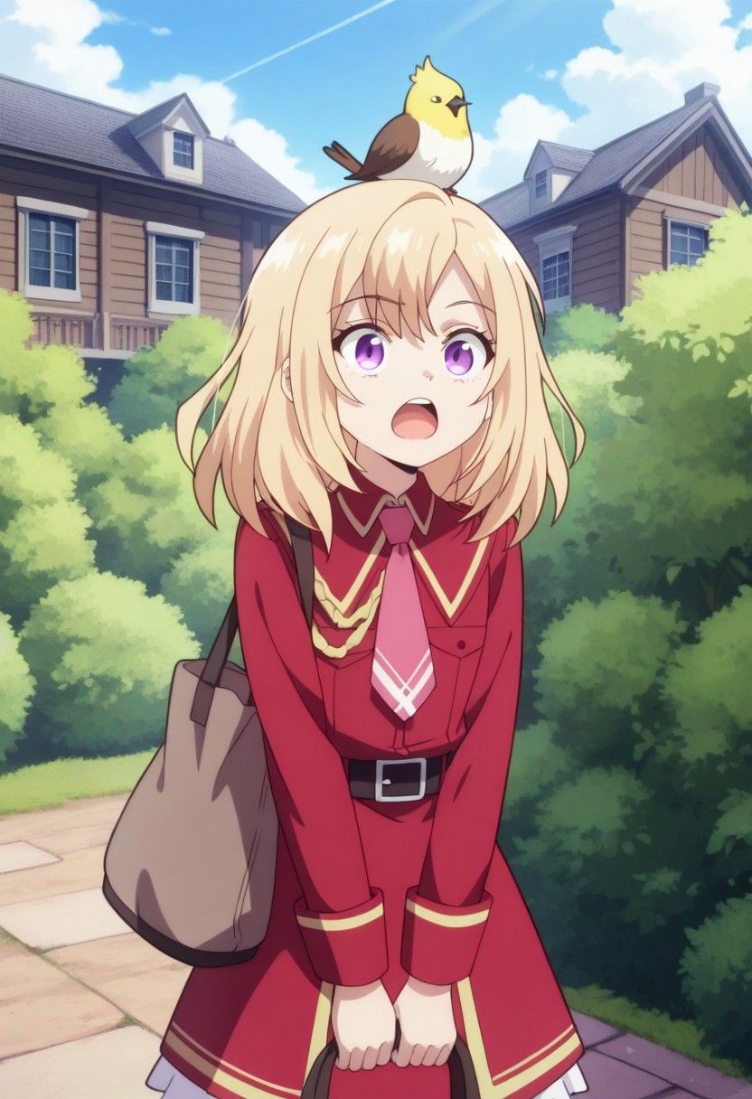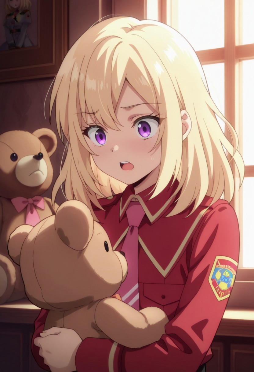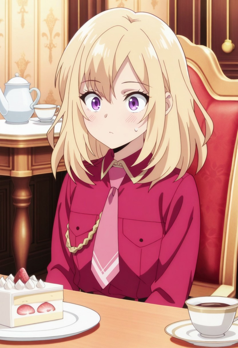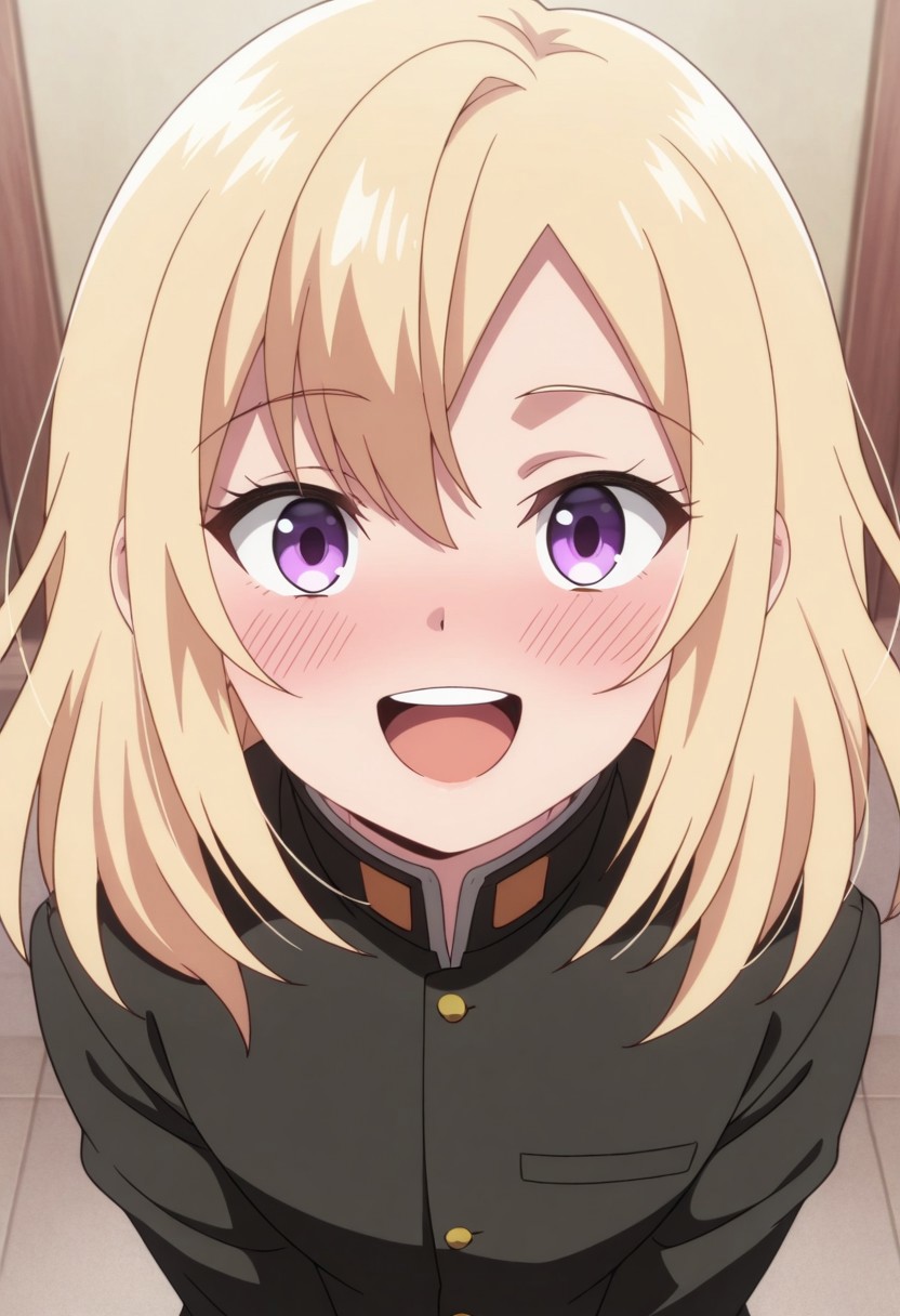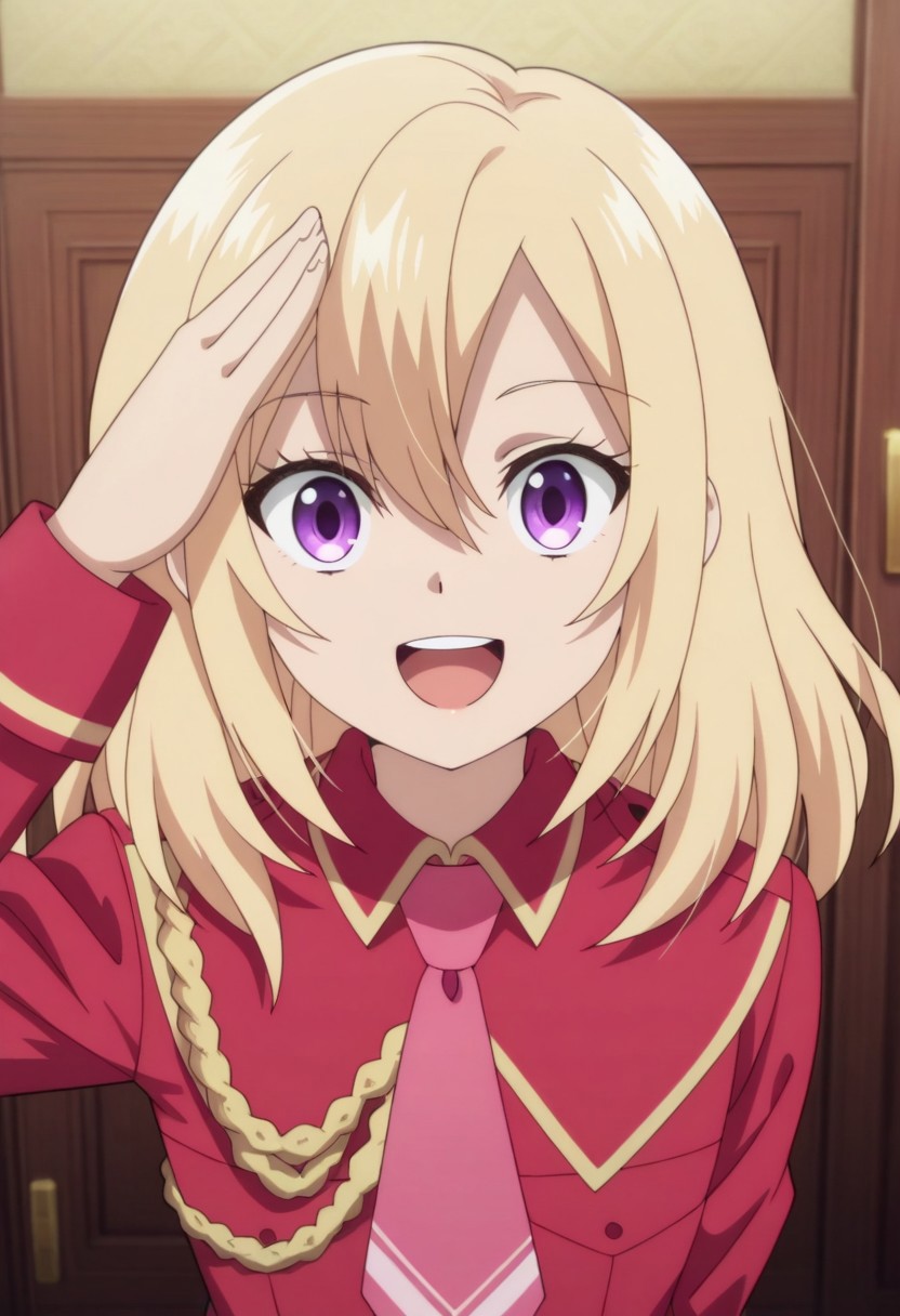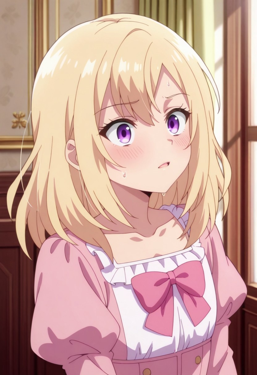 트리거 단어: savelle jill, 중간 길이 머리, 금발, 보라색 눈
