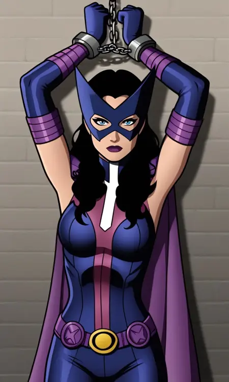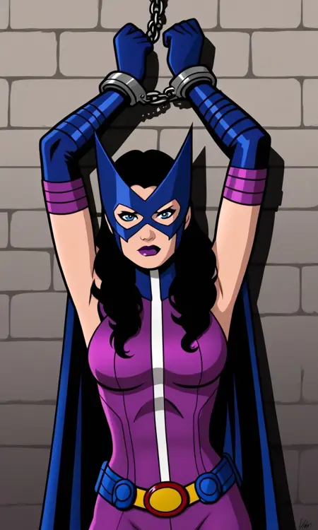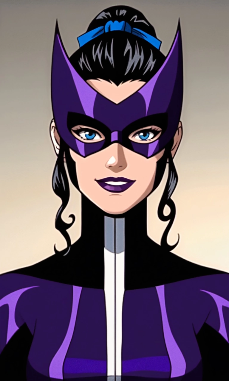1woman,solo,black hair,mask,purple mask,purple lips,blue eyes,huntress(dc),bodysuit,cape,elbow gloves,utility belt,shoulder pads
