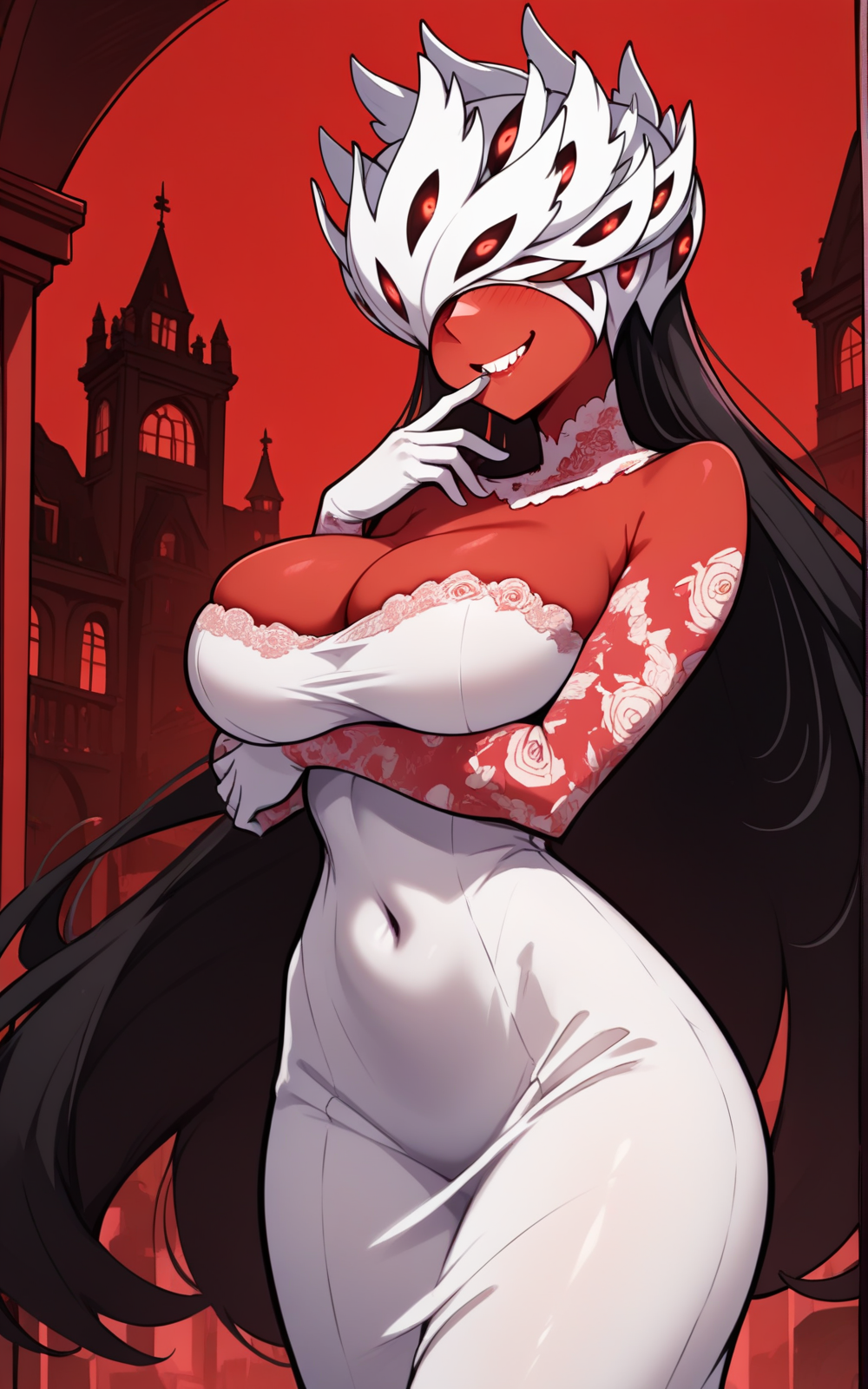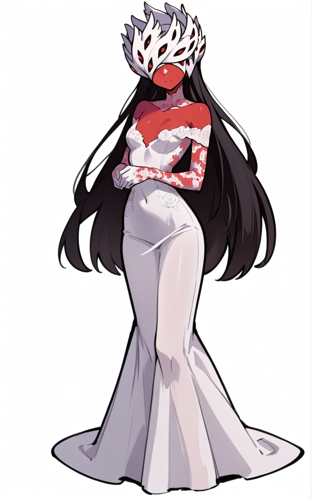 Reinforcement Tags: red eyes, black sclera, extra eyes, red skin, mask, white mask, black hair, long hair, white hairFor her Outfit:** dress, white dress, long dress, bare shoulders, long sleeves, skin tight