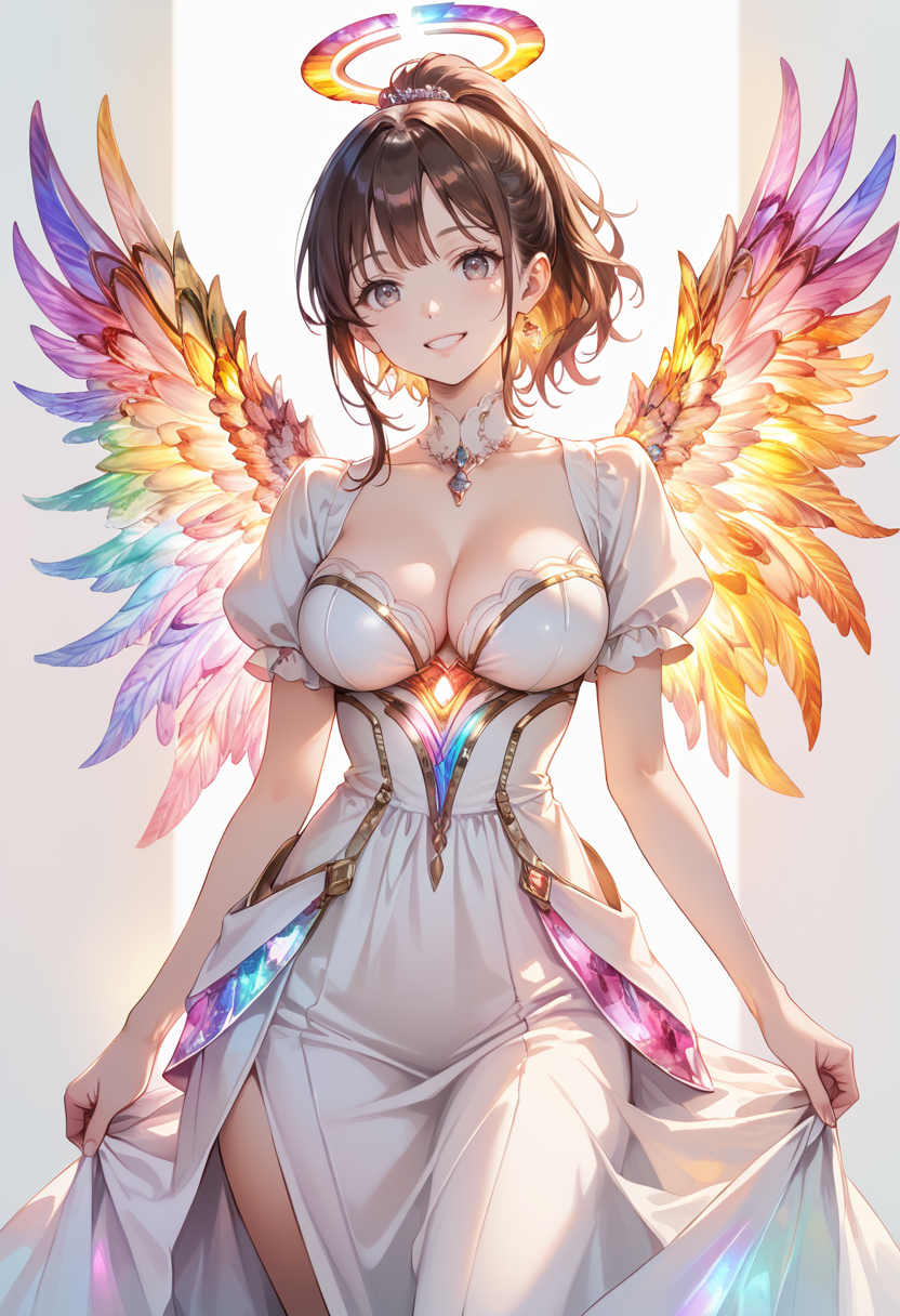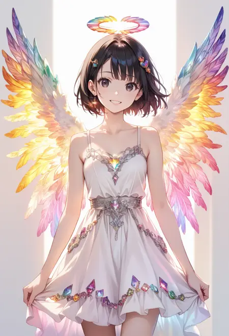 推奨ワード: colorful prismatic angel wings を追加すると、カラフルな翼が生成されることが多いです。