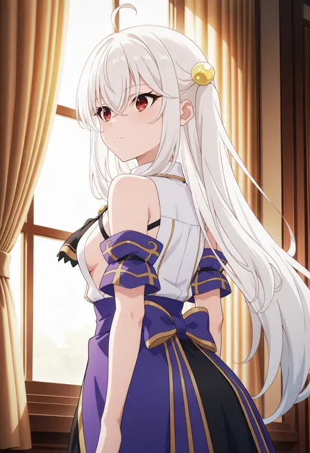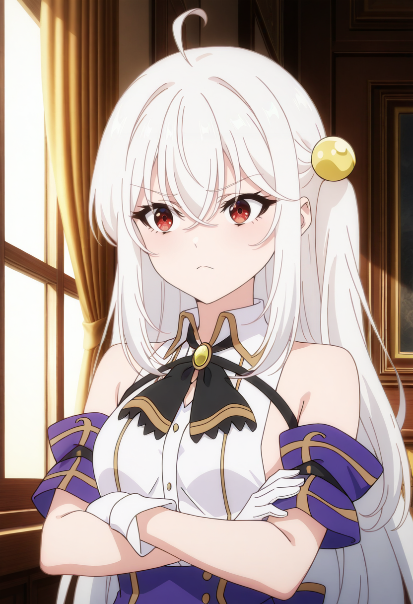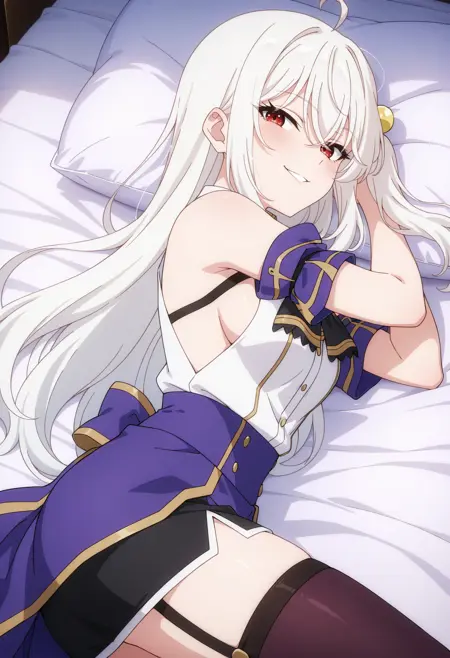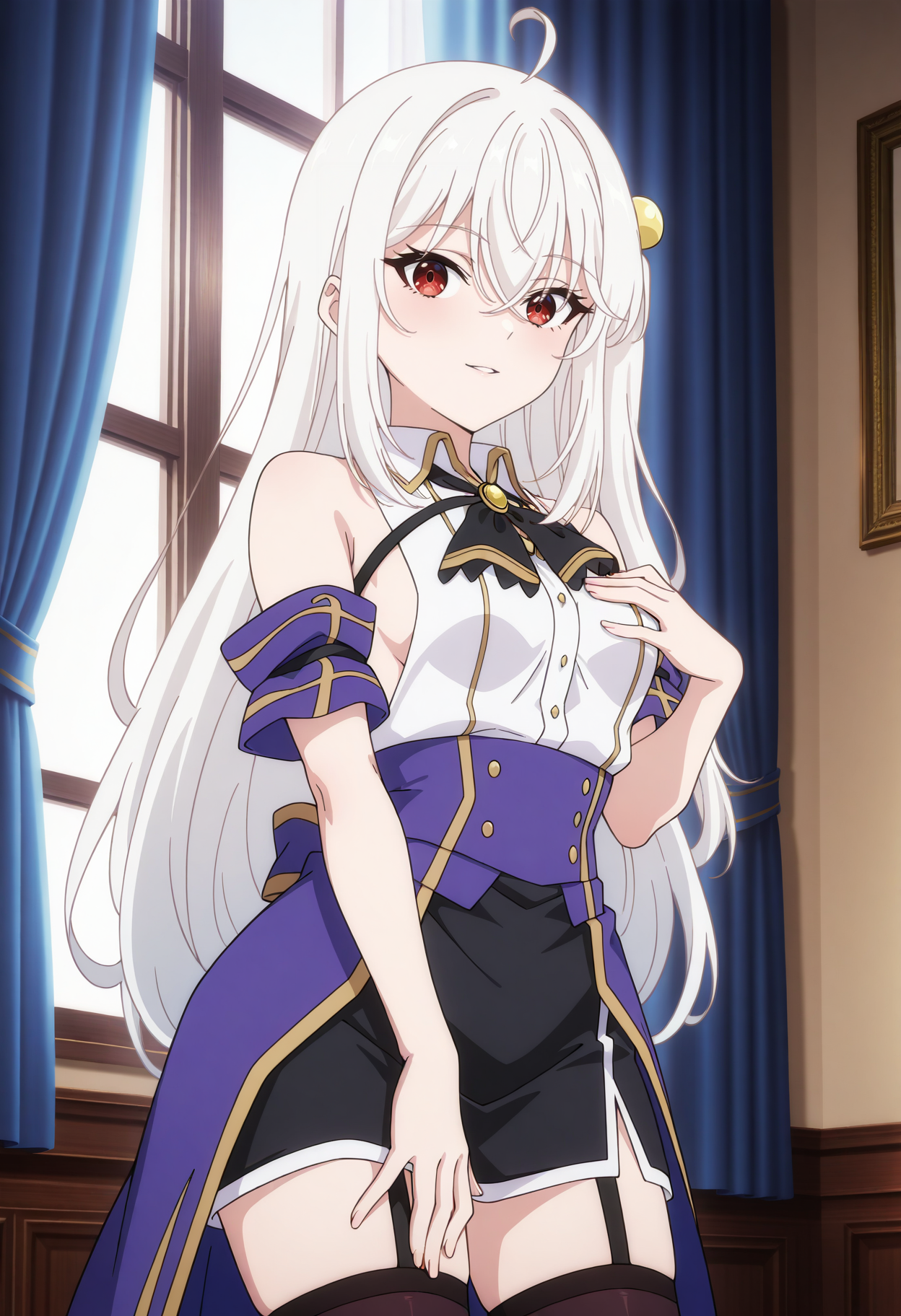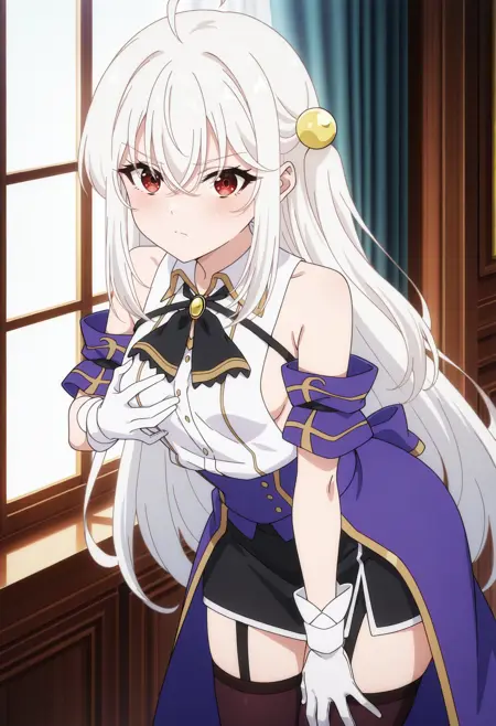 ベース:ninym_r、1girl、アニメ風カラーリング、長い髪、白髪、額に髪がかかる、ヘアボブ、片側を上げた髪、サイドロックス、アホげ、交差した前髪、赤い目、白いノースリーブシャツ、取り外し可能な短い袖、黒いブローチ付きアスコット、胸ストラップ、紫のウェストケープ、黒いミニスカート、ガーターストラップ、黒い太ももハイソックス、白い手袋、中程度の胸
