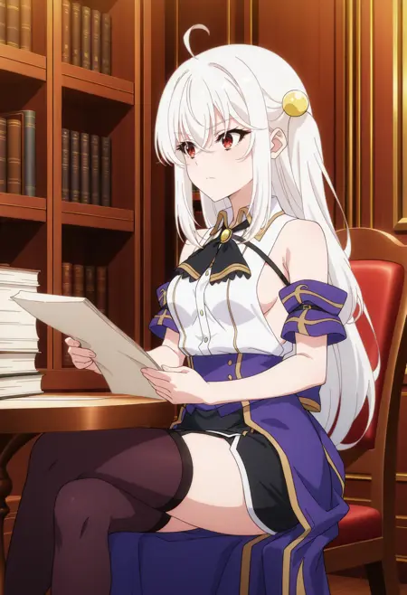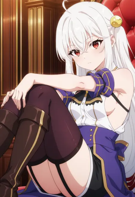 基础:ninym_r, 1girl, 动漫上色, 长发, 白发, 发丝遮眼, 发饰, 单侧束发, 刘海侧发, 天线辫, 交叉刘海, 红眼, 白色无袖上衣, 分离短袖, 黑色胸针领结, 胸部绑带, 紫色腰裙, 黑色迷你裙, 吊袜带, 黑色过膝袜, 白色手套, 中等胸部