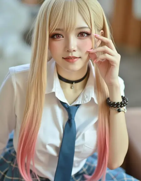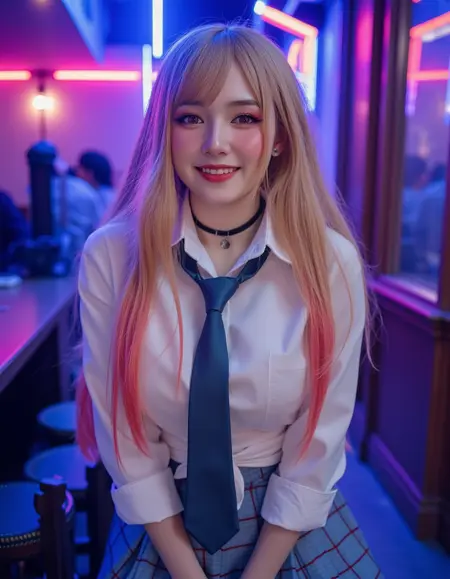 Mar1n_K1tagawa Cosplay,长发,金发,红眼,穿孔,耳环,耳洞,钉状耳环,黑色项圈,松散的领带,校服,白色衬衫,百褶裙,格子裙,珠串手链,手腕饰带,长指甲,夜晚,她在酒吧,霓虹灯为蓝色和粉色
