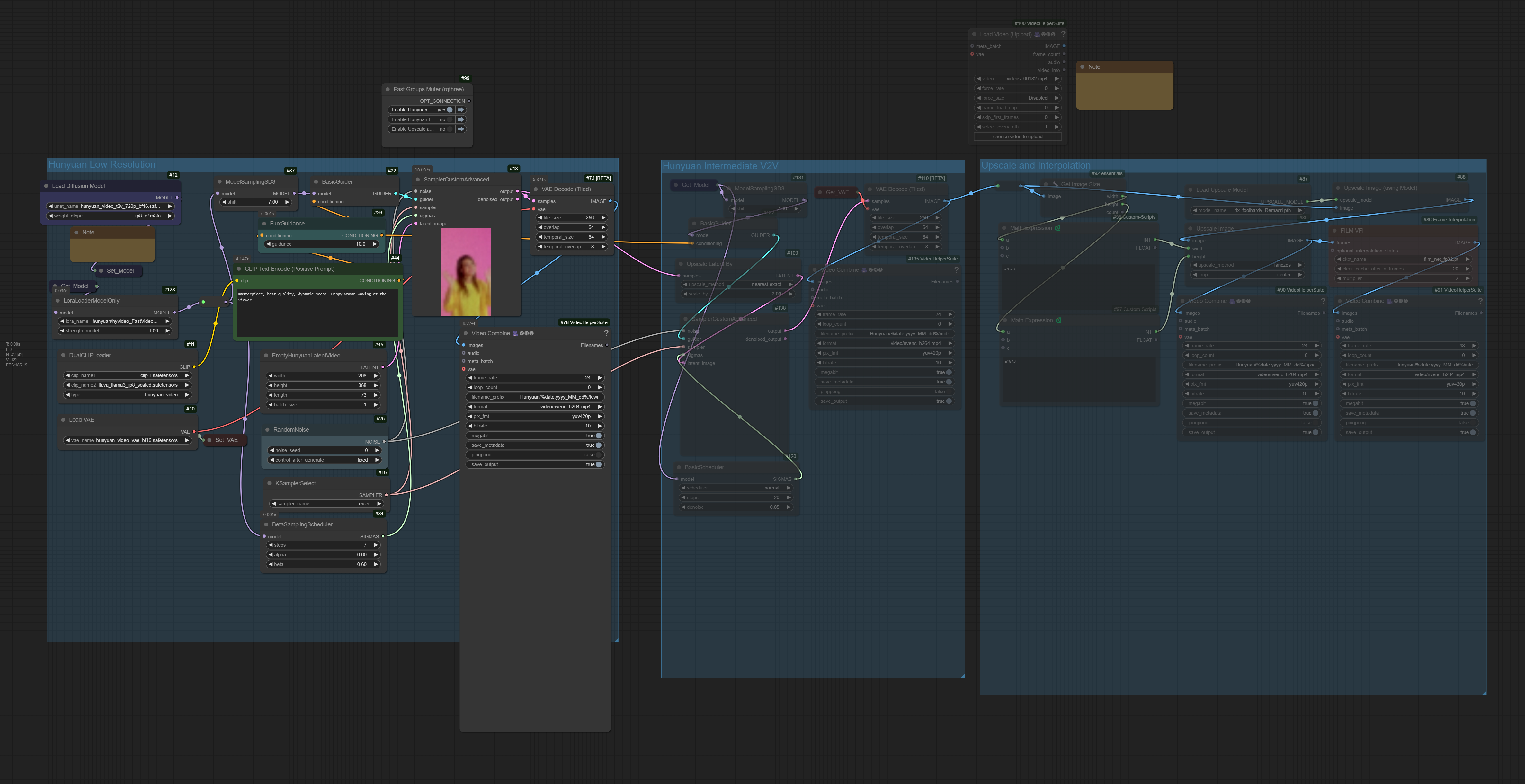Workflow for Hunyuan video that can generate a small resolution video first very quickly, then upscales it with Hunyuan v2v when you find one you like. There is a third step for upscaling and video interpolation.