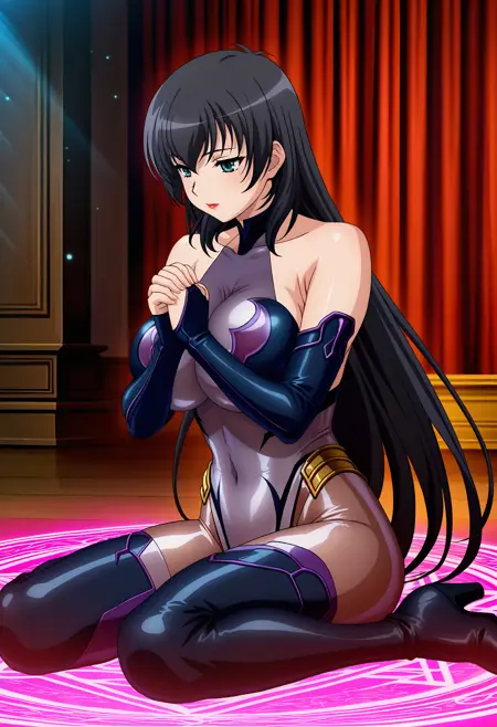 Recommend Prompts (clothing①)collarbone, bare shoulders, turtleneck ,impossible leotard, highleg leotard, purple leotard, impossible clothes, see-through, shiny clothes, skin tight, fingerless gloves, elbow gloves, thigh boots, high heel boots,