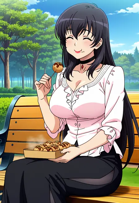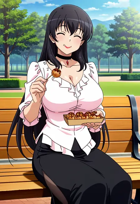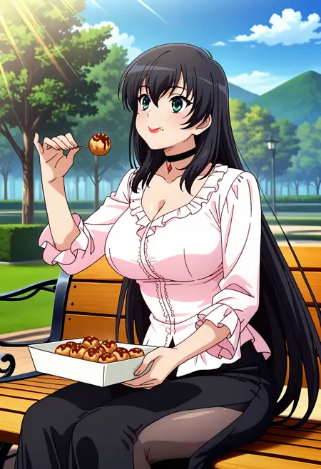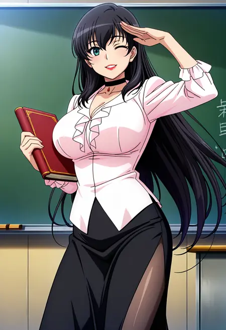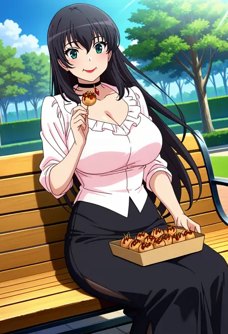 推奨プロンプト(衣装②):黒いチョーカー、白いブラウス、ロングスカート、黒いスカート、サイドスリット、パンティーホース、ハイヒール