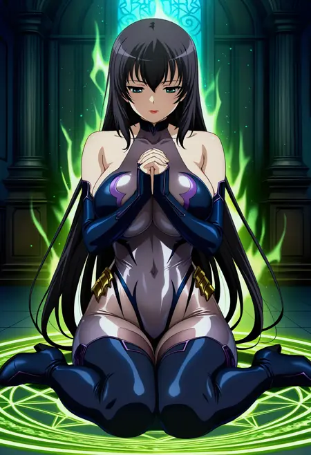 推奨プロンプト(衣装①):鎖骨、肩出し、タートルネック、不可能なレオタード、ハイレグレオタード、紫のレオタード、不可能な服、透け感、光沢のある服、肌着のようなフィット感、指なしグローブ、肘までグローブ、太ももブーツ、ハイヒールブーツ