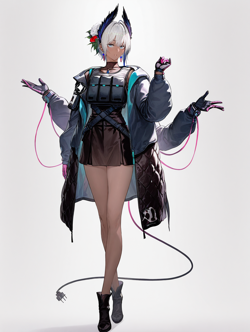 默认服饰:hair flower,skin tight,hooded coat,hood down,quilted clothes,bulletproof vest,two-tone gloves,black shorts,high-waist shorts,black boots,