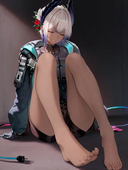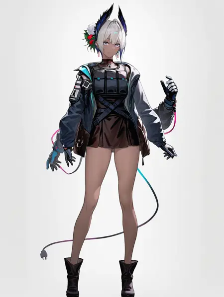 two extra mechanical arms, bare legs, jacket, vest, two-tone gloves, boots,