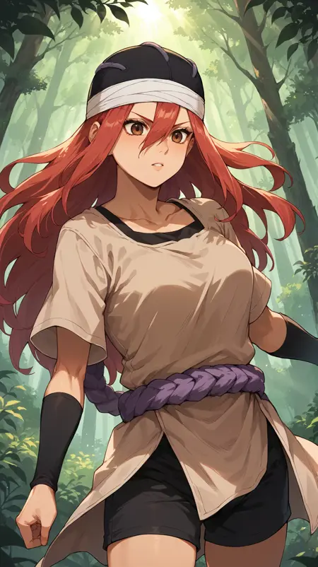 long hair, red hair, brown eyes, black hat, tan tunic, purple rope, black arm warmers, black shorts, aTayuya