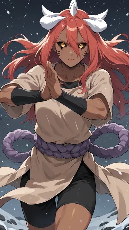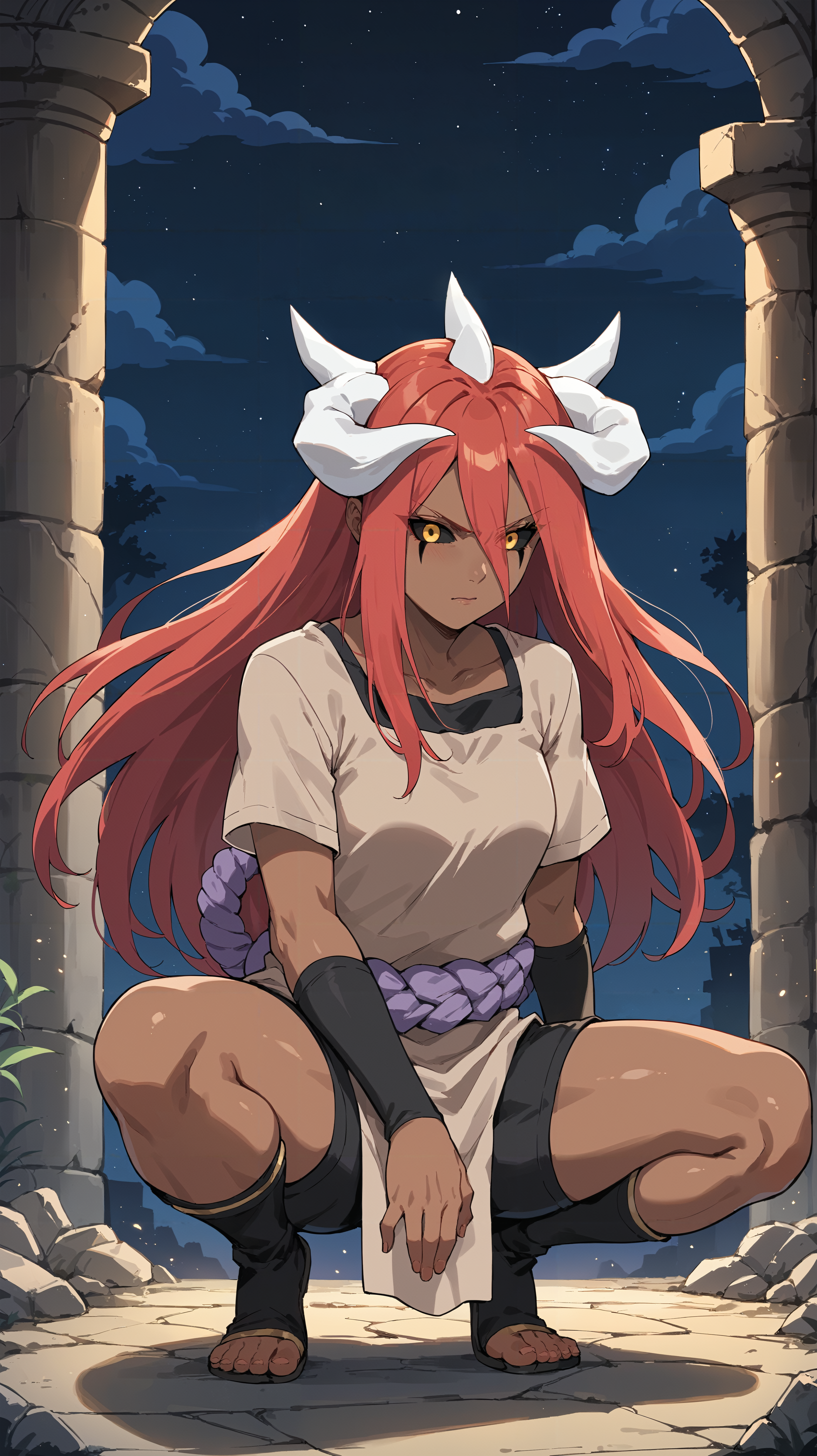 long hair, red hair, yellow eyes, black sclera, facial markings, dark skin, white horns, bTayuya, tan tunic, purple rope, black arm warmers, black shorts