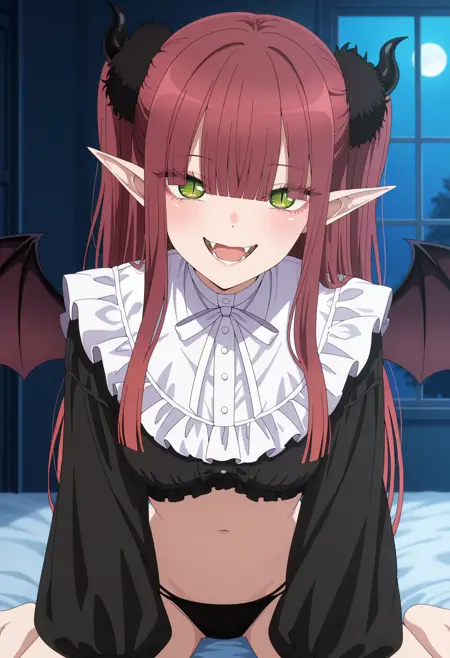 long hair, blunt bangs, two side up, red hair, green eyes, slit pupils, black nails, black horns, pointy ears, demon wings
