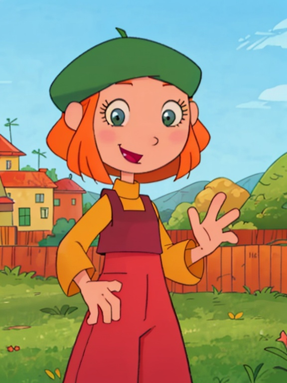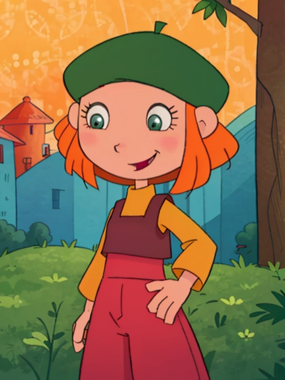 Lucy: ソロ、1girl、Lucie、オレンジ色の髪、ショートヘア、ベレー帽、長袖の黄色いシャツ、赤い縞模様のオーバーオール、青い目、緑の靴、