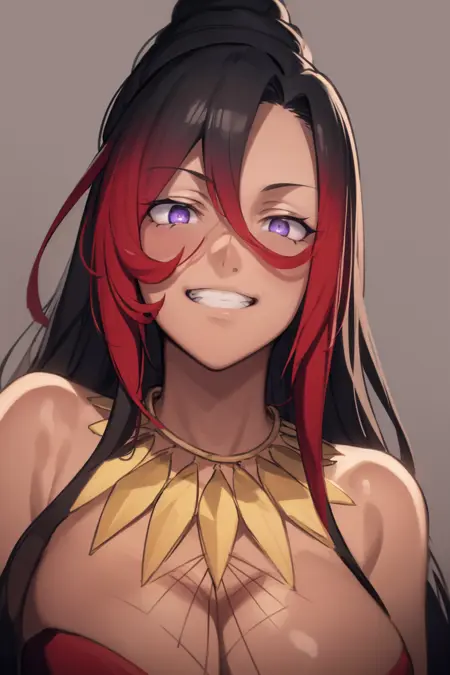 その他のプロンプト:多色の髪、黒髪、赤髪、紫の目、青い目、濃い肌、ネックレス、大きな胸、赤いドレス、白い肘手袋、タイツ、パンスト、裸の肩、胸元