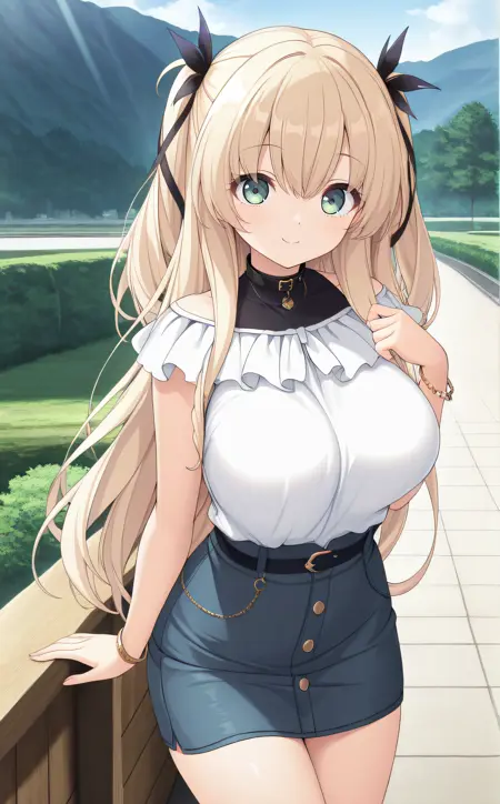 black collar, white shirt, blue miniskirt, bracelet
