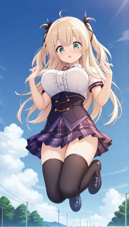 school uniform, white shirt, short sleeves, corset, plaid skirt, black thighhighs