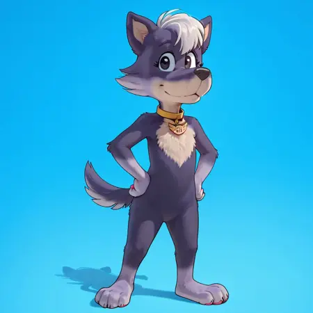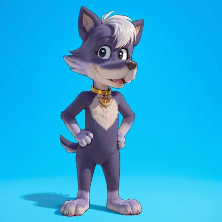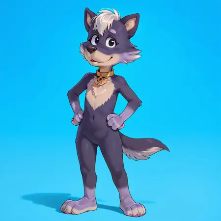 Dog, dog girl, purple and white fur, white hair, bangs, white chest fur, black eyes, black nose, gold collar, gold tag,