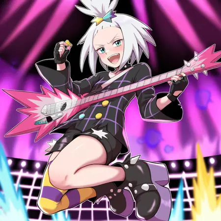 초커, 칼라 있는 재킷, 검은 재킷, 긴 소매, 노란 단추, 파란 셔츠, 검은 반바지, 손가락 없는 장갑, 검은 장갑, 한쪽 허벅지 양말, 찢어진 허벅지 양말, 줄무늬 허벅지 양말, 보라색 양말, 노란 양말, 플랫폼 부츠, 검은 신발