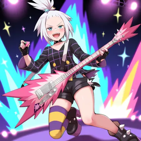 チョーカー、カラー付きジャケット、ブラックジャケット、長袖、黄色いボタン、青いシャツ、ブラックショートパンツ、フィンガーレスグローブ、ブラックグローブ、片方の太ももハイ、破れた太ももハイ、縞模様の太ももハイ、紫色の靴下、黄色の靴下、プラットフォームブーツ、ブラックの靴