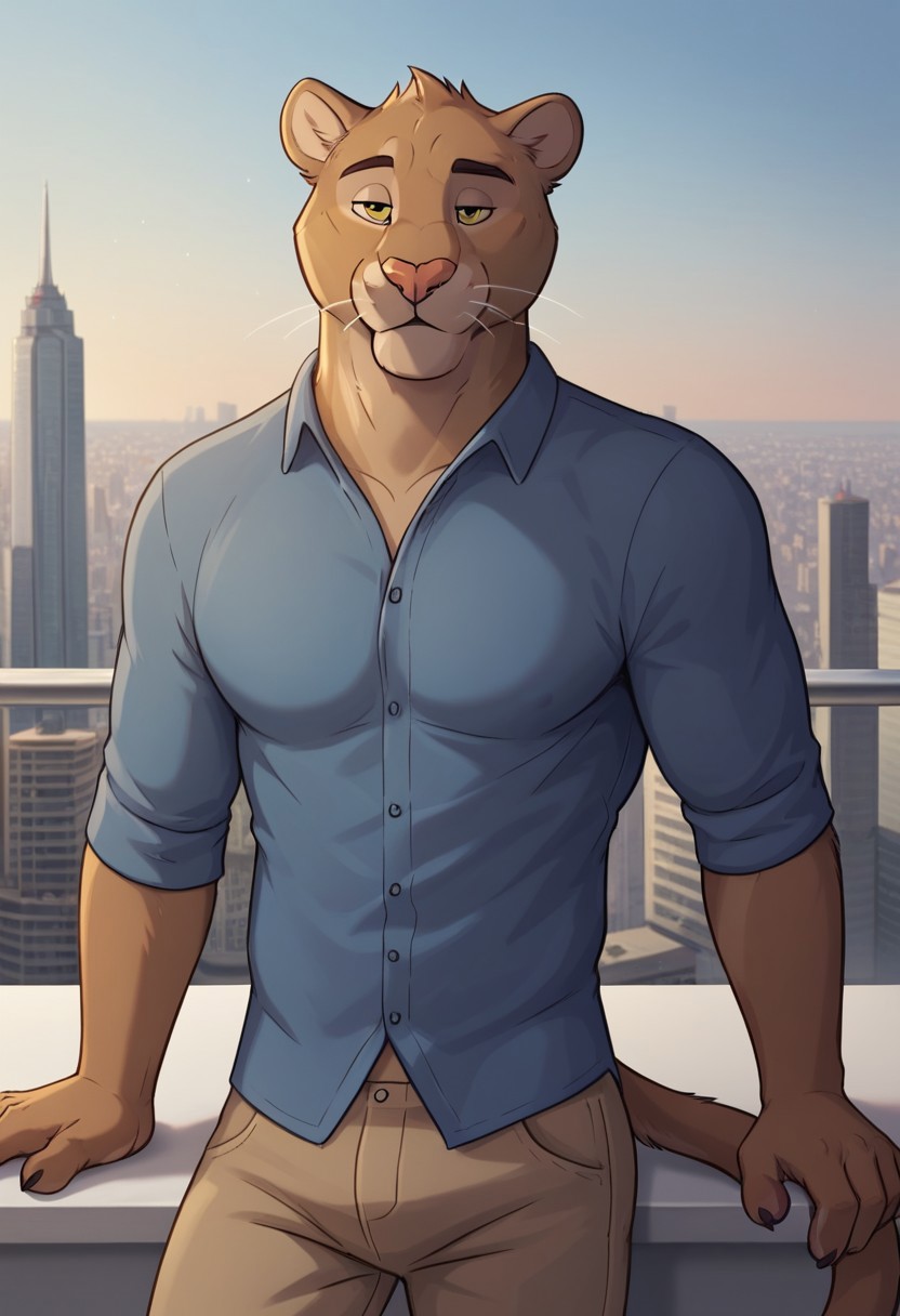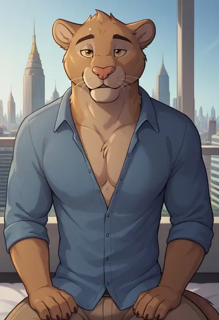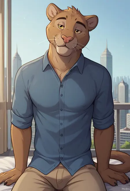 의상: 파란색 셔츠, 카키색 바지, 갈색 바지
